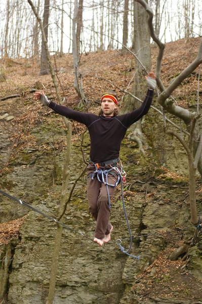 Jaro je nadějné a moje oblíbené. Dosti jsem se těšil na chození a navíc jsem si přes zimu vyhlídnul místečko pro svoji první highline. Odhad zněl 12m long, 10m high. Někdy kolem 20. dubna (jak říkám nějaký hovado mi vykradlo auto) a chápu, že se laskavý čtenář rozčílí, protože údaj není exaktní. Nevadí to, popojedem. Po asi 8 měsících jsem seděl na highline. Bál jsem se minimálně sedmnáct a půl krát víc než loni. Moje pohyby posouvání se kupředu do místa, kde se dá bezpečně postavit a neservat se z kůže o okraj připomínaly elektric buggie dance a podobně jsem se cítil. Totální psycho. Čím víc se člověk bojí, tím víc dělá slušně řečeno kundibádovin. Takže jsem k odsedce ještě přidal sedačku od sedáku, kterou jsem pak nemohl najít a odepnout. Podívat se dolů by znamenalo jasný pád. Nějak sem se z toho vymotal, zpocenej jak vrata od chlíva jsem se zvednul udělal asi 3 kroky a…….poprvé v životě zakusil, jaké že to je čapnout lajnu. Pro tento týden mi to stačilo a zdrcen odjel jsem z víkendu do práce. Červík vrtal jak vidiák a příští víkend jsme tam byl nastoupen znovu. Tentokrát jsem nic nepodcenil, setup za pár minut, první pokus, lajnolap, druhý pokus, lajnolap. Vyhodnotil jsem to jako „blbej terén“ a šel na to z druhé strany. V té době ještě nebylo STB, ale někteří ze zakladatelů už tam byli a dosti mi fandili. Pošoupl jsem se, zvedám se, stojím a mlask odsedka – tenkrát poprvé. Připadal jsem si jako urychlovač elektronů CERN, málem jsem potupně vrhnul a pokusy vyhodnotil pro ten den za skončené. Zítra je taky den, oběd, pár piv, večírek, sladký spánek na Bišíku a v neděli v plný formě zpátky u lajny na Stárkovské stráni. Ten den se mi to povedlo. Na první pokus, jedním směrem, tři kubíky endorfinu a znovu proběhlo frííííííííí eeeeeez e brrrrrd. Bomba. Lajna nese název „Po větvovém flámu“ a je 20 long 18 high, hodnotím jen jednou * , protože je to rokle a nemá expozici.